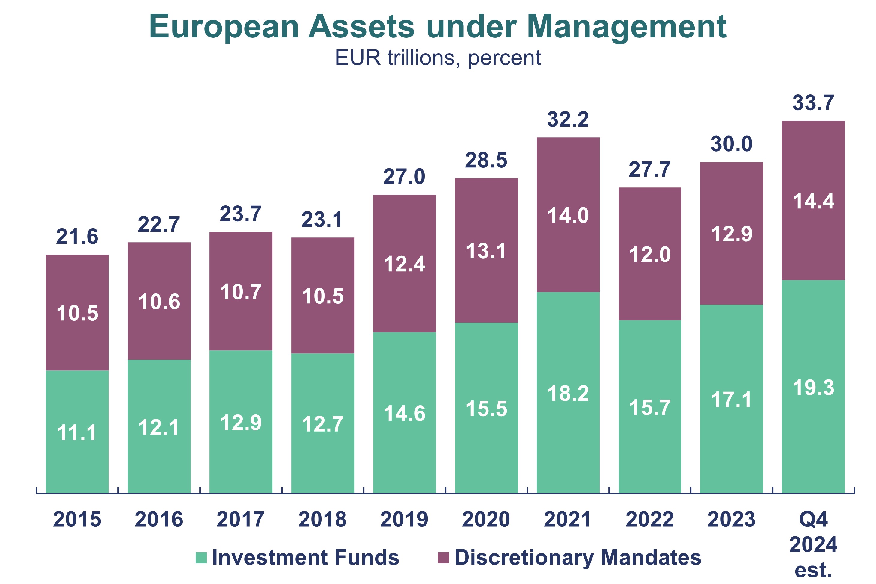 As stock markets continued to rise during 2024, we estimate that AuM in Europe reached a new record of EUR 33.7 trillion at end Q4 2024.