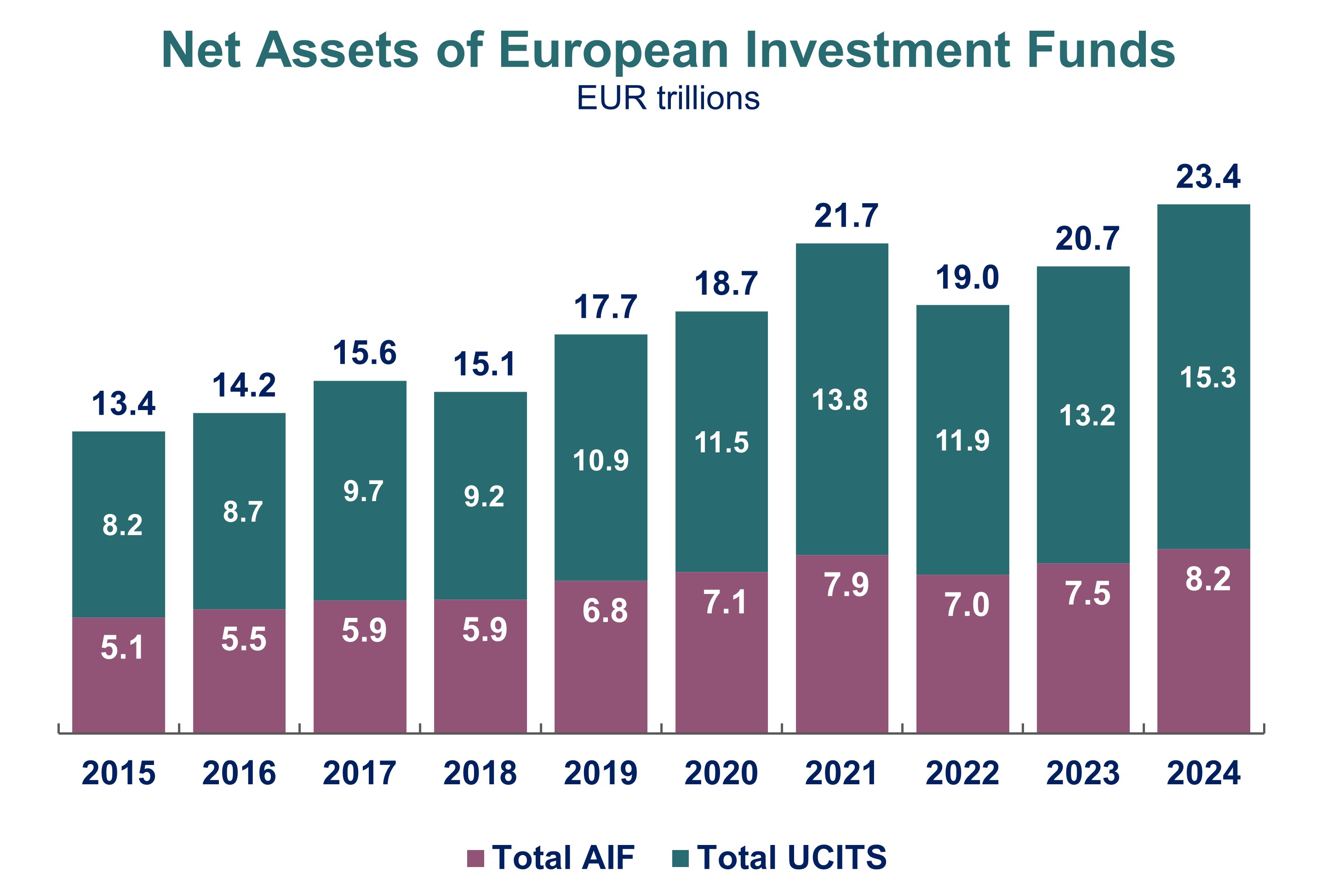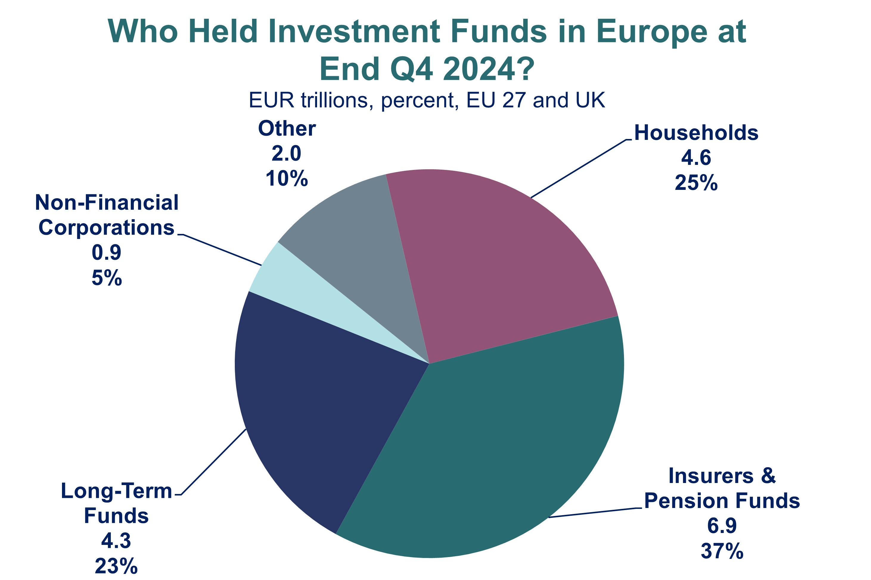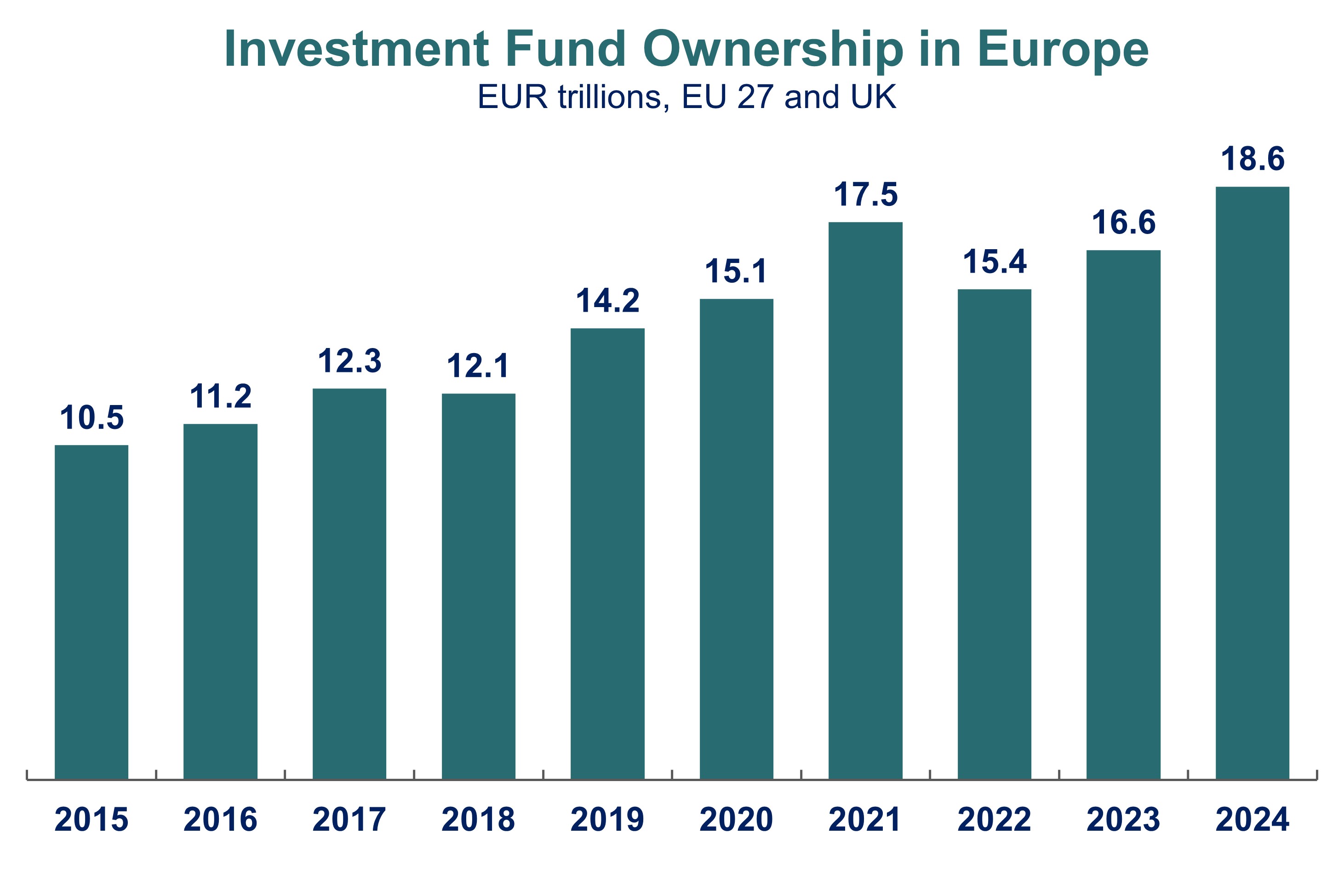 Total fund ownership in Europe amounted to EUR 18.6 trillion at the end of Q4 2024, compared to EUR 10.5 trillion in 2015.  These amounts refer to the funds that are bought and held by investors in Europe (EU 27 + UK), excluding funds domiciled in Europe but sold outside Europe.
