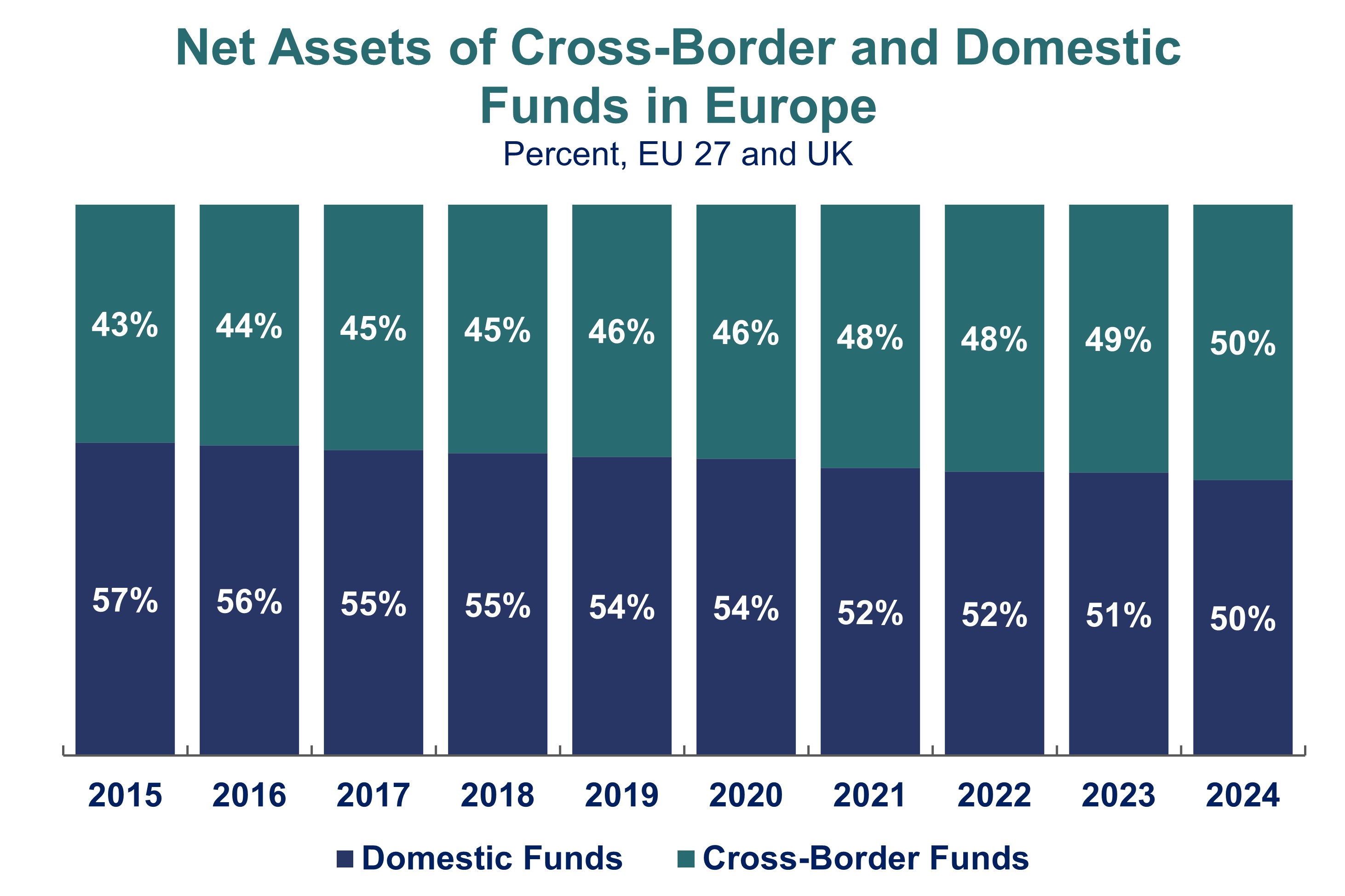 The net assets managed by cross-border funds amounted to EUR 11.81 trillion at the end of Q4 2024, compared to EUR 11.76 trillion for domestic funds. The share of cross-border fund assets increased from 43% in 2015 to 50% in 2024.