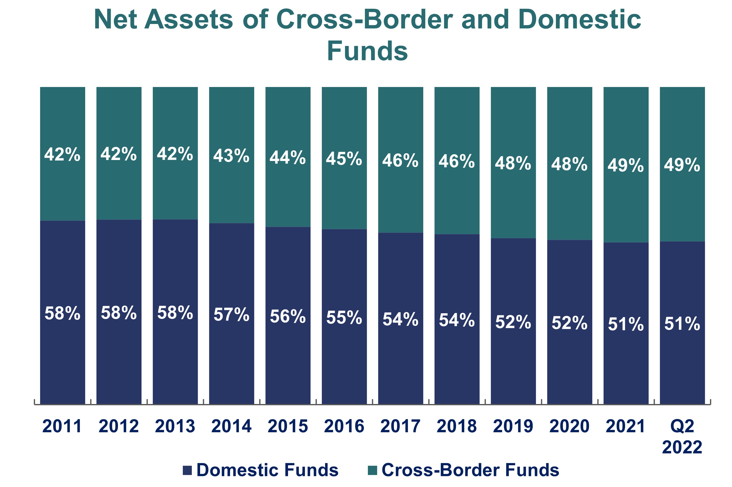 The net assets managed by cross-border funds amounted to EUR 11.81 trillion at the end of Q4 2024, compared to EUR 11.76 trillion for domestic funds. The share of cross-border fund assets increased from 43% in 2015 to 50% in 2024.
