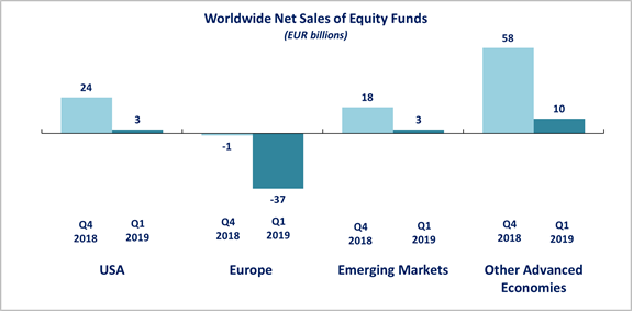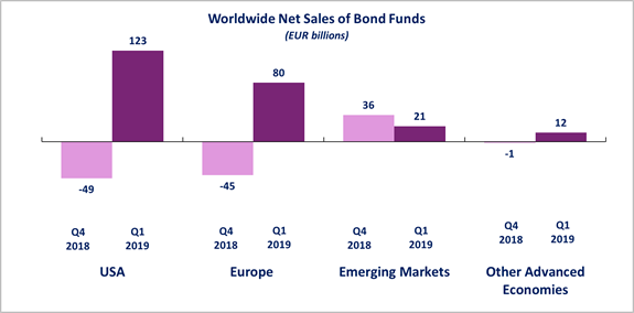 • Worldwide bond funds recorded net inflows of EUR 236 billion in Q1 2019, compared to net outflows of EUR 59 billion in Q4 2018. These strong global sales were mostly driven by inflows in the United States (EUR 123 billion), Europe (EUR 80 billion) and emerging markets (EUR 21 billion, of which EUR 20 billion in China).