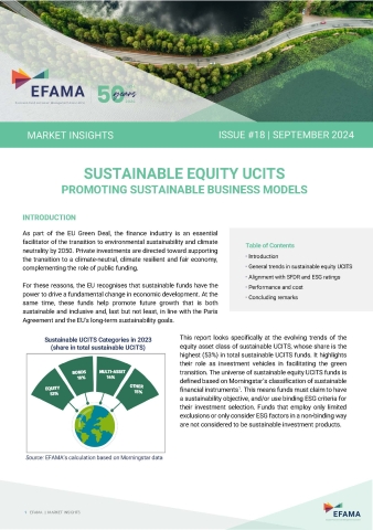This report looks specifically at the evolving trends of the equity asset class of sustainable UCITS, whose share is the highest (53%) in total sustainable UCITS funds. It highlights their role as investment vehicles in facilitating the green transition. The universe of sustainable equity UCITS funds is defined based on Morningstar’s classification of sustainable financial instruments1. This means funds must claim to have a sustainability objective, and/or use binding ESG criteria for their investment selection. Funds that employ only limited exclusions or only consider ESG factors in a non-binding way are not considered to be sustainable investment products.