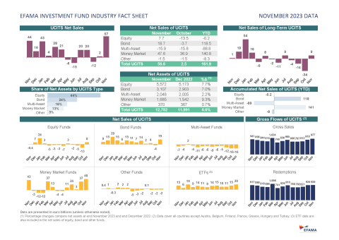 Bernard Delbecque, Senior Director for Economics and Research at EFAMA, commented: “We saw net sales of UCITS equity and bond funds recovering substantially in November. This was on the back of good news about inflation and the expectation that interest rates will not be raised further.”