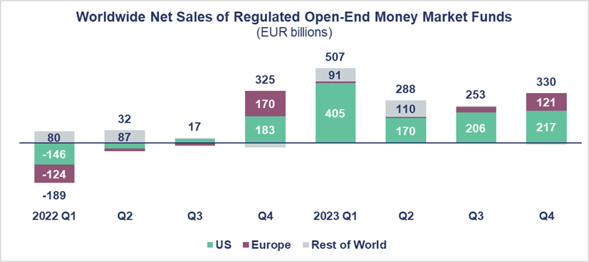 Thomas Tilley, Senior Economist at EFAMA, commented on the Q4 2023 figures: “Worldwide money market funds (MMFs) saw record net inflows of almost EUR 1.4 trillion over 2023, with about EUR 1 trillion of these net inflows in the United States. Many US investors were attracted by the higher returns offered by MMFs compared to bank deposits.”